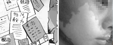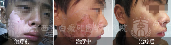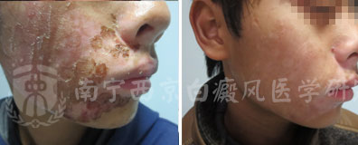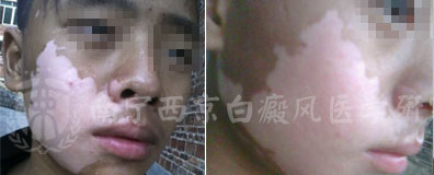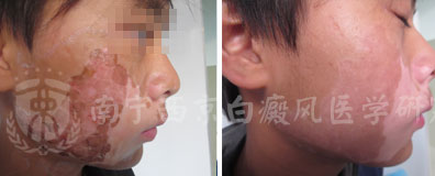 严超(化名),16岁,家住南宁宾阳。据患者自述2012年7月的一个早晨,在洗脸的时候发现自己右脸颊处有一块白色的小斑点,因为暑假里基本上都在外面帮家人做农活或者在外面玩耍,把自己晒得跟黑蛋一样,所以脸上的白斑显得很突出。再加上夏季蚊虫较多,以为是蚊虫叮咬的,当时也没有在意。但是随着时间的流逝,发现脸上的白斑开始不断的扩大。此时我真的开始着急了,父母看到我脸上的情况,心里也十分的着急。由于我的家庭状况比较差,没有足够的经济能力负担我到市里的大医院去治疗。但是父母仍然没有放弃对我面部白癜风的治疗,看见一些小广告说是有祖传秘方专治白癜风,包治愈、随治随走、七天就能治愈。父母都带我去试过但是用了那些偏方以后,我脸上的白斑就发展的更迅速了,直至半张脸都是的。推荐阅读>>>《滥用白癜风偏方,会产生哪些危害呢?》