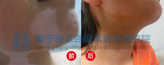 2、使用黑色素细胞培植术强化治疗白斑,促使下巴处和颈部白斑大面积快速康复;