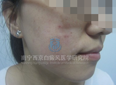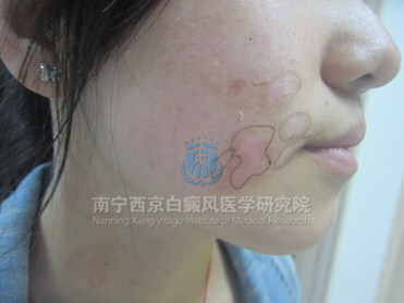 【患者在我院治疗一个疗程后,脸部白斑颜色减淡,边缘变得清晰】