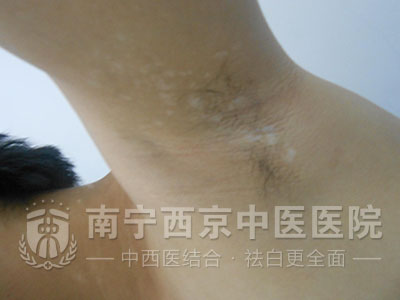 ▲现病史:腋下、颈部患有白斑,边缘模糊不清,曾在地方诊所使用药物治疗,具体药物不详,治疗无效果。近来病情加重,故来我院就诊。
