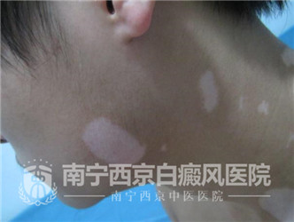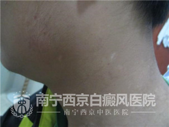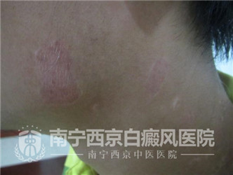 张毅(化名),男,24岁,百色人,一天,早上起床洗漱,在对着镜子时,发现颈部有一块块的白斑,由于白斑比较小就没放在心上,过了一段时间后白斑竟然长大了,他以为是皮肤过敏所致就去医院买了一些皮炎药膏涂抹,可是很长一段时间过去了也不见好,去大医院检查,被告知得了白癜风。担心长在面部,担心影响工作,心情焦虑,通过上网了解到我们医院,来到医院就诊。