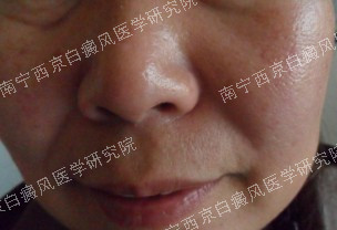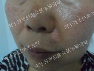 ▲病史:三月前,患者发现鼻侧白斑,在某医院治疗无效后,经别人介绍来我院治疗。