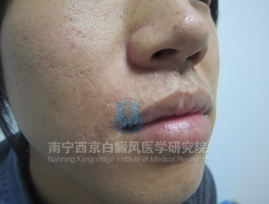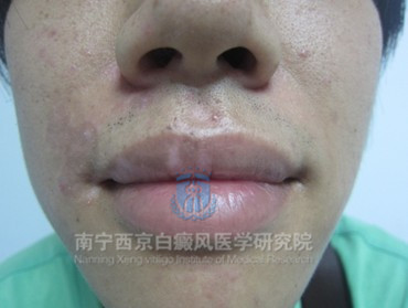 康复过程:治疗15至30天,采取蓝氧活性净血祛白疗法治疗后,白斑部位有散在、片状色素岛出现,可以看到原来的白斑处长出肉红色新肌肤,二个月后,病情稳定,采取黑色素细胞培植术治疗,治疗7天后,患病部位白斑消失,与正常肌肤无异。待白斑基本消失后,为了确保效果,再结合抗复发治疗,对病情进行双向固巩,标本兼治。