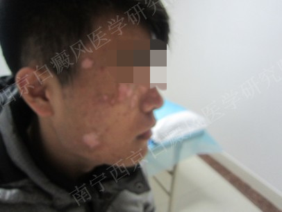 姚华4年前发现眼角有白斑,由于颜色很淡,难以察觉,所以姚华选择观察一段时间再说,这么一拖就是拖了半年之久。后来白斑扩大,整个脸颊都有,姚华不得已去了当地一些小诊所治疗,医生开了一些药吃了将近4个疗程也没有效果。中间一直放弃治疗近两年,后来经家门口人介绍来到我院。