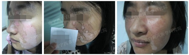 陈晓花于今年4月份来我院治疗,曾在当地医院治疗无效,后来到我院。陈晓花左眼角白斑已经有4年病史,在4年内采取药物控制虽然病情得到控制,但是一直没有根治。今年不知不觉中白斑竟然扩散到整个脸部,去了当地医院同样是药物治疗结合手术治疗一段时候后没有起色,最后在网上了解到我院后来我院治疗。