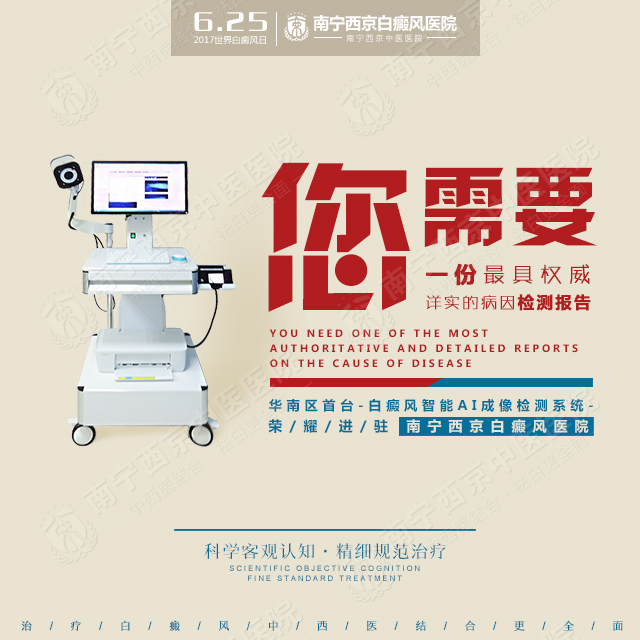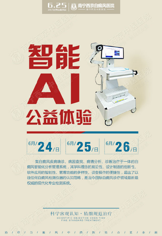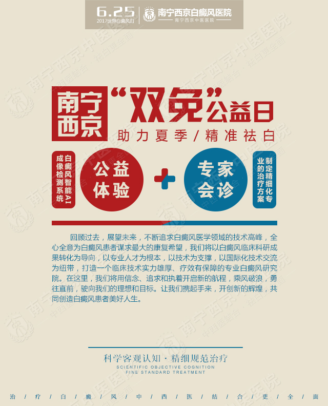 针对我国白癜风持续低龄化和高发问题,同时缓解“看病难、看病贵、挂知名专家号”等现状。正值6.25世界白癜风日之际,南宁西京白癜风医院再次率身先行,立于责任高度,承载健康使命,切实践行公益行动于(2017.6.24—6.26)开展为期3天的“双免公益日”惠民活动。(白癜风智能AI成像检测系统公益体验+院内白癜风专家联合会诊),助力广大白癜风患者早日摆脱疾病困扰,重拾健康黄皮肤,找回自信与尊严。